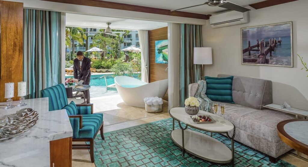 You’ll find a wide range of rooms and suites at both Sandals Grande Antigua and Sandals Barbados. Accommodations at both resorts are a bit older and more dated than some other Sandals resorts, but they are still quite nice. The top tier butler suites at both are spacious and luxurious, and come with 24-hour in-room dining and personal butler service.